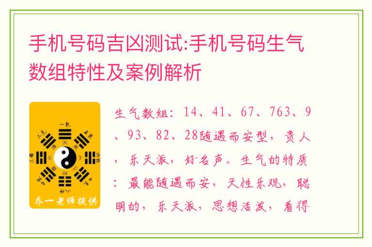 生气数组:14、41、67、763、9、93、82、28随遇而安型,贵人,乐天派,好名声。生气的特质:最能随遇而安,天性乐观,聪明的,乐天派,思想活泼,看得开