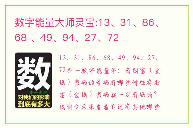 13、31、86、68、49、94、27、72乔一数字能量学:有财富(金钱)密码的号码有哪些特征有财富(金钱)密码就一定有钱吗?我们今天来看看它还有其他哪些特征