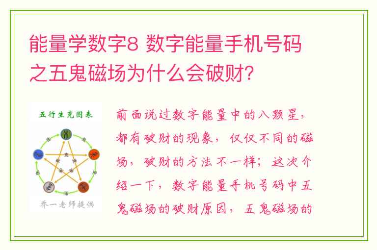 简介前面说过数字能量中的八颗星,都有破财的现象,仅仅不同的磁场,破财的方法不一样;这次介绍一下,数字能量手机号码中五鬼磁场的破财原因,五鬼磁场的代表的数字是