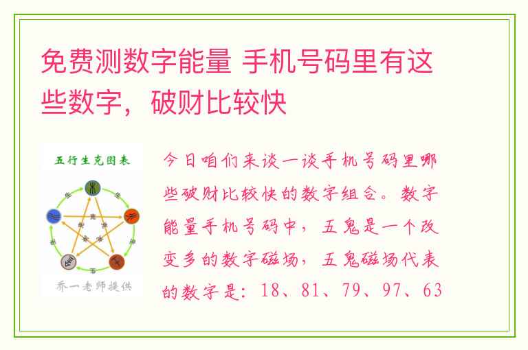简介今日咱们来谈一谈手机号码里哪些破财比较快的数字组合。数字能量手机号码中,五鬼是一个改变多的数字磁场,五鬼磁场代表的数字是:18、81、79、97、63、36、